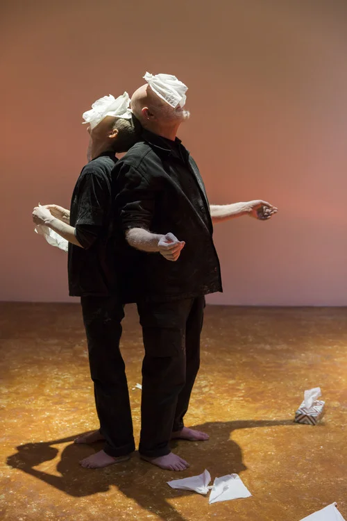 Nestled between 2 rooms on the first floor of Palazzo Mora, a rotting fish is nestled between the feet of Alastair MacLennan and Sandra Johnston, collaborating artists from Northern Ireland. The artists hold onto one another as they balance the fish’s dead weight between their feet and drag the fish across the floor. They are dressed similarly, wearing solid black that exposes their bare feet and bare heads. They are clearly individuals, but in this space, operating as a single being. This is pronounced by the shadow cast on the wall that makes it appear as if there is, in fact, only one body engaging in this action. In another action, MacLennan and Johnston stand back-to-back, palms face up, and heads pointed upwards. They each balance a single tissue on their face that gently captures minute vibrations produced by their breath. There are moments when this breath appears to be one breath, MacLennan and Johnston’s torsos expanding and contracting in unison. These slippages from two beings into one are common occurrences in this 5-day piece, titled Let Liminal Loose.
