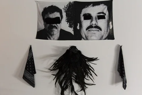 When encountering Boston-based artist Vela Phelan’s En Ti Confio, one enters a space that is illuminated by projector light emanating from a corner of the room. The images moving through the projection are pulsing with black and white shapes and pixels. The image of a statue on a television is one of the only recognizable forms coming through this intentionally skewed transmission. Objects, predominantly technological devices moving towards obsolescence, (tape recorders, record players, etc.) await action as they line the space where the wall meets the floor. In front of the projection, an altar has been constructed on the floor. On top of the altar is a small bust similar to that which is seen in the projection. Carefully composed on the walls are a variety of black objects: a feathered headdress, bandanas, black plastic bags, etc. Most notably, several towels are hung throughout the space that bear the image of the infamous drug trafficker, Juaquin El Chapo Guzman. Some towels have been imprinted with an image of Jesus Malverde, a Mexican Saint who in life stole from the rich to give to the poor. Both of their eyes have been blacked out with lines of black fur. This visual treatment of these portraits simultaneously references abduction posters, while pointing to the physical resemblance between these two men.