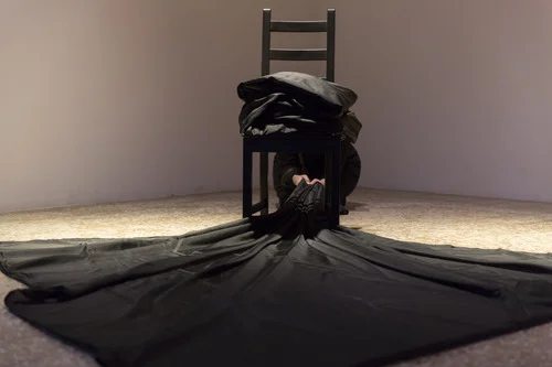 As Arsem peers out the window, an insect flies by and catches her eye. Her curiosity ignites the curiosity of the others in the room. This is the first of many invitations for the audience to engage in a way that is unique within a traditional performance context. Some viewers stand and peer out other windows while others peak through a closet in the space that is slightly ajar. Many also occupy a close proximity to Arsem’s body. Her actions are modest and she often sits and stands in places in the room where the audience is gathered. In these moments, Arsem is not recognizable to all as “the performer.” This invisibility is shattered in the moments when Arsem looks around the room, engaging each person in eye contact. This tension between looking and being looked at continues to gain intensity throughout the weeklong duration of the piece. On the second day of Marking Time, Arsem introduces another black cloth and engages in various actions that include her covering and uncovering her body. In these variations of seeing and inviting herself to be seen, the cloth provides a similar function as the blindfold. Arsem’s actions with the cloth make her vulnerable, invite the audience to engage, and position time as the primary concept of the work, rather than something that is consequence or bi-product.