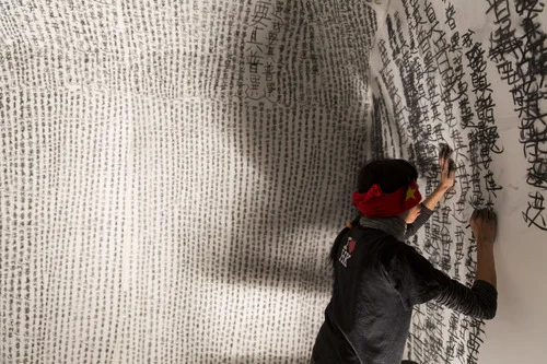 Installed in a room on the 3rd floor of Palazzo Mora the phrase “I want real universal suffrage” has been repeatedly and methodically written in Chinese on half of the walls. In this piece titled, Wish You Were Here, Hong Kong artist WenYau is crouched on the floor, blindfolded with the national flag of the People’s Republic of China and wearing a t-shirt that reads “I Heart HK.” Wen Yau continues to repeatedly write the phrase in charcoal on the other half of the space without the sense of sight. Over the duration of approximately 4 hours, the writing not only fills the walls, but also spills onto the floor.