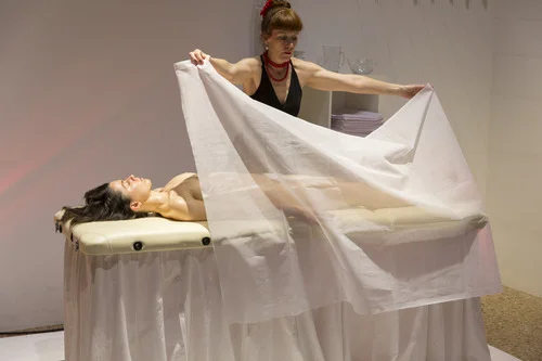 I have arrived at the moment that the body lying on the table is being released from Julie Vulcan’s touch. His skin is covered in oil, and as he opens his eyes, a look of surprise washes over his face. I suspect that he did not anticipate that there would be so many people gathered in the room to witness the encounter. Vulcan holds up a white cloth, an offering of privacy, the man wraps his body, and slowly disappears from the room. For 6 days, Australian artist Julie Vulcan will engage in one-to-one encounters that are witnessed by a larger audience in I Stand In, a performance that honors the forgotten, misplaced, unrecovered and removed. Vulcan asks participants to be surrogates for a faceless individual while she cleanses their bodies in a corpse-washing ritual. Before each body is released, the oil that has accumulated on their skin is pressed into a cloth. As the oil is absorbing, Vulcan writes a few words on the bottom right hand corner of the cloth in red ink. Each shroud is hung throughout the space, an evolving installation serving as a reminder of the bodies that have been offered in this testimony to the lost. As the shrouds accumulate and the cloth overlaps, the text begins to disappear, making the words scrawled across the bottom difficult to read. “Only you will have to live with this,” “A bloody hand and a piece of rock,” and “whispering light feeling” are a few of the phrases that I can decipher. The text conjures imagined last thoughts of the departed and/or evidence of those who have disappeared. As I watch the man leave the space and Vulcan begin to clean the table in preparation of her next exchange, I realize that I have walked into the moment that this ritual, as promised in Vulcan’s statement about the work, transforms from something to honor the dead, into something to honor the living.