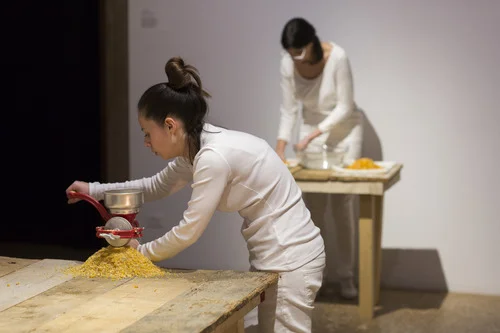 This use of the surrogate body is echoed in another work happening in the room that the audience must pass through in order to witness Vulcan’s piece. Mexican artist Melissa Garcia Aguirre’s Desapareciendo / Disappearing tackles tensions between the collective body and unified body through the use of delegated action. 5 stations are installed throughout the room. At each station, a performer dressed in white stands in front of a heavy wooden table that holds the tools that they will eventually activate. The cycle begins with one performer shucking corn kernels into a glass bowl. When the bowl is full, they pass the bowl to the second station where the kernels are counted and tallied on a sheet of lined paper. Once accounted for, the kernels are taken to the 3rd station where they are bathed in a bowl of water. At the 4th station, they are dried on a white cloth. When taken to the final station, the kernels are sent through a manual corn grinder where a pile of meal accumulates on the surface of the table. Each day, the performers move to the next station to experience each role in this assembly line.